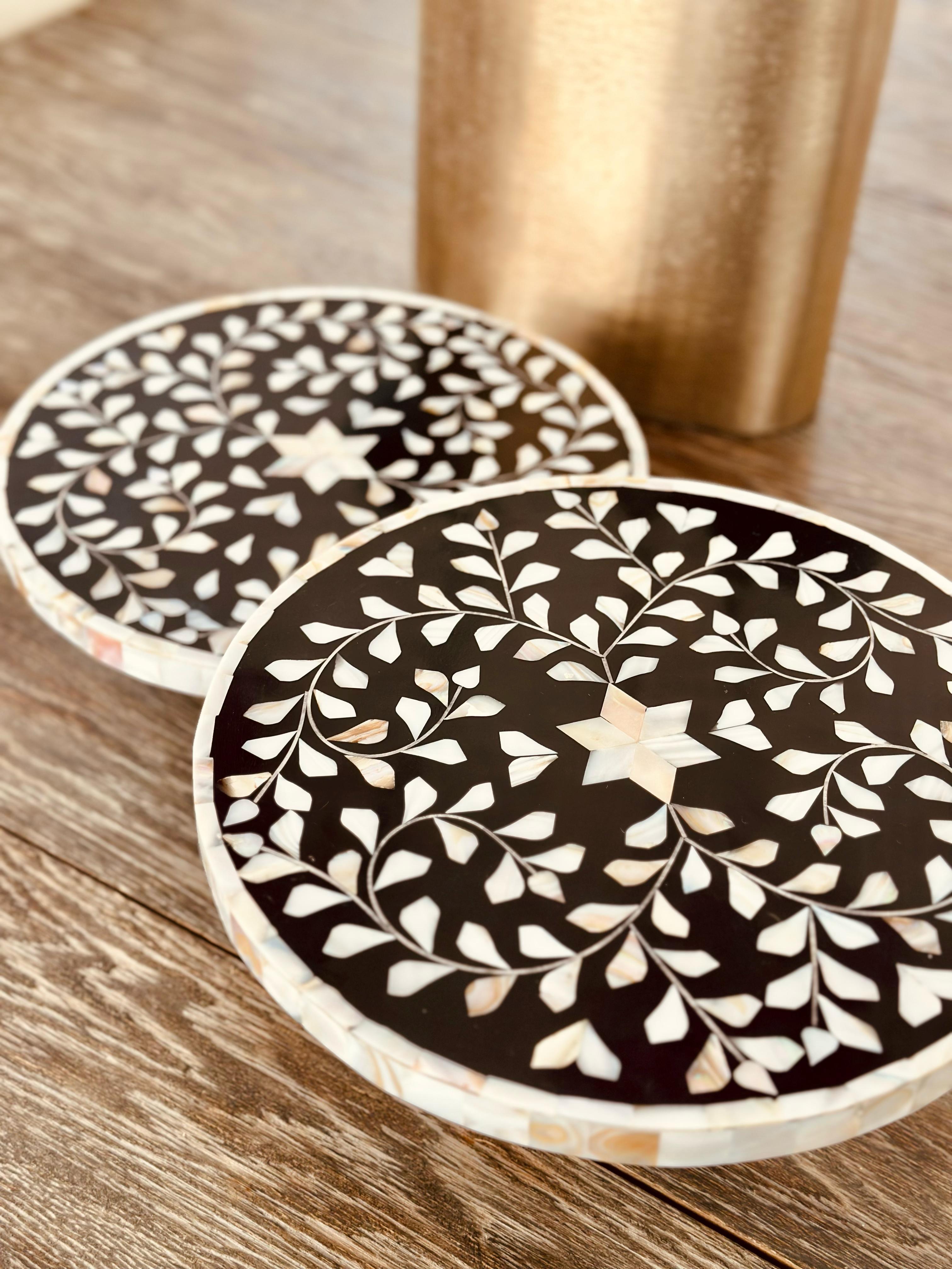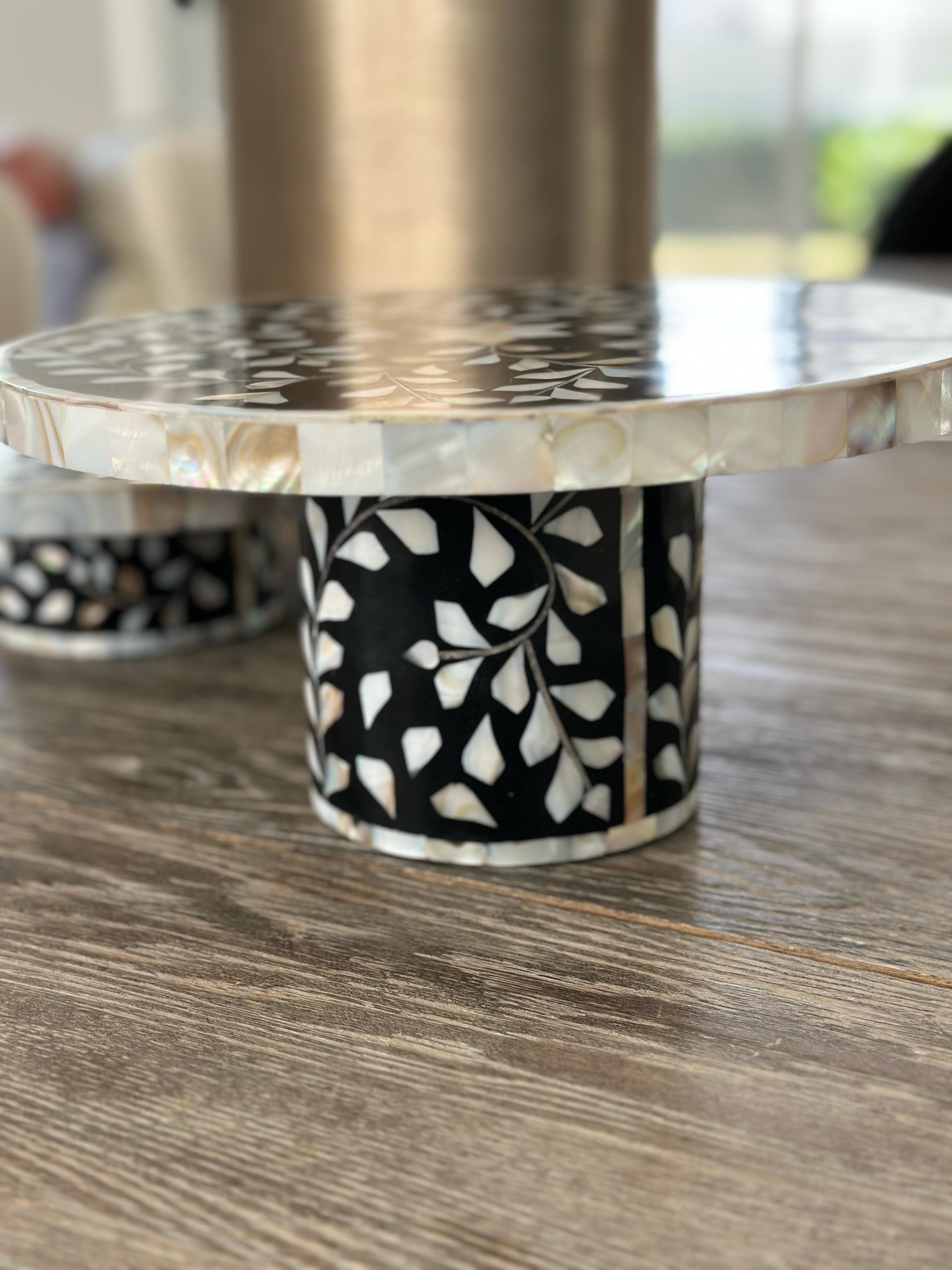 Introducing our exclusive Zahra round cake stand featuring a stunning mother of pearl florl design, meticulously handcrafted by our skilled artisans. This piece seamlessly blends classic elegance with modern touch for a sophisticated appearance.