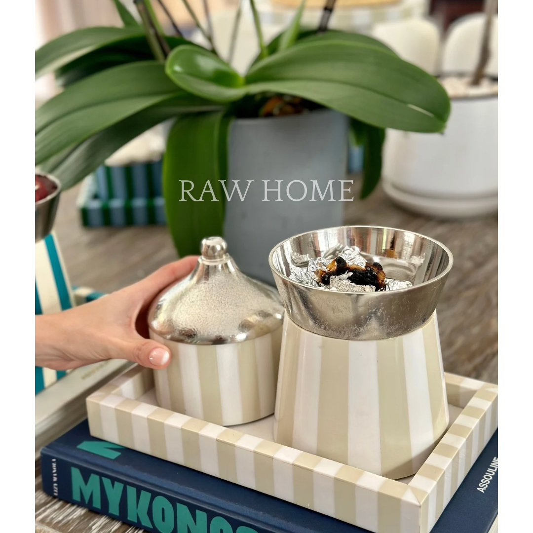 Whether utilized as an elegant burner set or as a verstile bowl and box for easy snacks like dates, chips and nuts. This piece invites endless possibilities .